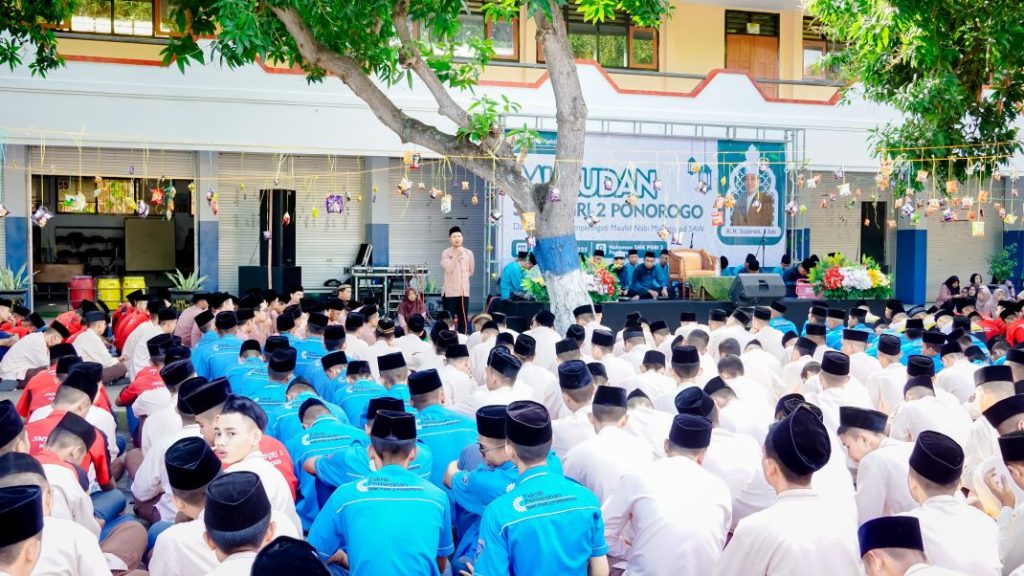 Hari Jumat, 19 September 2025 menjadi salah satu momen yang penuh berkah bagi seluruh keluarga besar SMK PGRI 2 Ponorogo. Sejak pagi, suasana sekolah sudah berbeda dari biasanya. Lapangan yang biasanya digunakan untuk kegiatan olahraga dan upacara, kali ini disulap menjadi tempat berkumpul ribuan siswa, guru, dan tenaga kependidikan untuk memperingati Maulid Nabi Muhammad SAW 1447 H / 2025 M. Acara ini tidak hanya menjadi agenda rutin tahunan, tetapi juga wadah untuk memperkuat nilai spiritual, menumbuhkan kecintaan kepada Rasulullah SAW, sekaligus mempererat kebersamaan antara siswa dan guru. Sebagai salah satu peserta, saya merasa momen ini begitu spesial karena bisa belajar langsung dari kisah keteladanan Nabi sekaligus merasakan kebersamaan yang sulit ditemukan di luar kegiatan seperti ini.