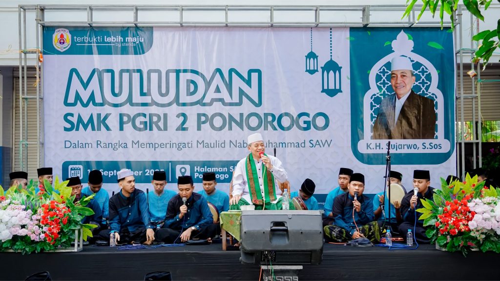humor yang menyegarkan. Para guru juga tidak kalah antusias. Mereka duduk di barisan depan, mendampingi siswa dengan wajah penuh kebanggaan. Momen ini benar-benar memperlihatkan bagaimana hubungan guru dan siswa tidak hanya sebatas pengajaran di kelas, tetapi juga terjalin dalam ikatan spiritual yang hangat. Selain itu, dekorasi panggung juga menambah suasana meriah. Spanduk besar bertuliskan “Muludan SMK PGRI 2 Ponorogo” terpampang di belakang panggung. Hiasan bunga warna-warni dan gantungan hadiah kecil berupa snack membuat suasana semakin hidup.